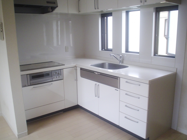 写真のようにI型が2つ重なった形状のものをL型キッチンと呼びます。見た目にもL字に見えるのが特徴です。L型キッチンはキッチンのコーナースペースを活用しながらも、開放的でお洒落に見えるキッチンのためI型と同様に人気があります。しかしI型よりも作業スペースの確保が必要になるため、ある程度まとまったキッチンスペースが必要です。また価格もI型より高くなりやすく、間仕切り壁などの影響を受けるとキッチンスペースとダイニングやリビングの連続性が失われ、閉鎖的に見えてしまうこともあります。