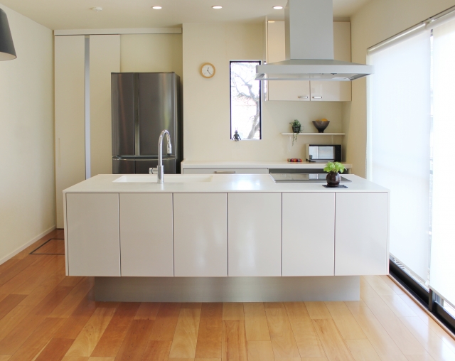 アイランドキッチンは、作業スペースやガスコンロ、流し台スペースが明確に独立しているキッチンのことをいいます。アイランドとは英語で島を意味するため、独立型のキッチンをそう呼ぶようになりました。アイランドキッチンは独立している形状から開放感があり、また作業スペースも広々としているのが特徴です。独立部分をテーブルとして代用する使い方もあります。見た目に高級感があるためインテリアの一部としても強い存在感を発揮します。ただしこれまで解説してきたキッチンの中で一番高価なキッチンタイプで、インテリアの中心になりやすいデザインであるがゆえに、素材を安すぎるものにしてしまうとチープに見えてしまうデメリットもあります。また設置スペースにかなりの広さを要するため、計画の際には注意が必要です。