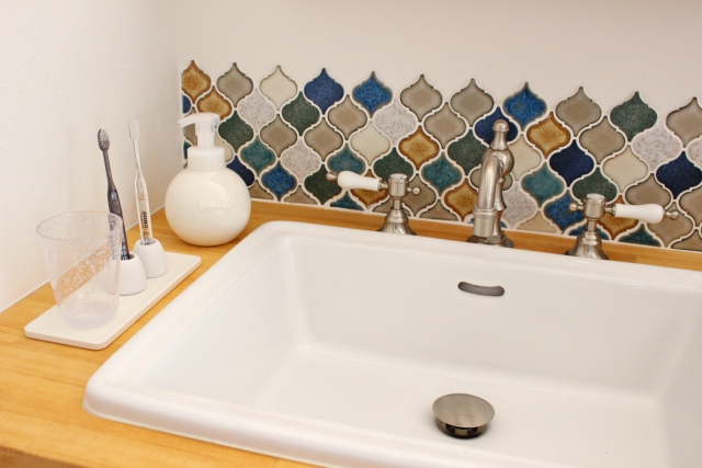 タイル材にはさまざまな色や形状のものがあり、独立型洗面ボウルなどの場合はその下の洗面台カウンターや壁の一部などにアクセントとしてタイルを埋め込む方も多いです。好きなデザインをタイルで作り上げることができ、意匠性が高いのも特徴です。また防水性の面で非常に優れており、色素沈着などもしにくい点から長い期間きれいな洗面台を保つことができます。しかし一方で、施工の際の手間がかかるため施工費・材料費ともに高くつくことも多く、タイルの間のシーリング目地が劣化に伴い黄ばむこともあります。また物を落とした衝撃などで割れてしまうことも多いため、取り扱いには注意が必要です。